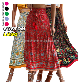 Custom מקסי ארוך חצאיות נשים מזדמנים ציצית גבוהה מותניים אלסטי גבירותיי פרחוני למתוח הדפסת בוהמי חצאית