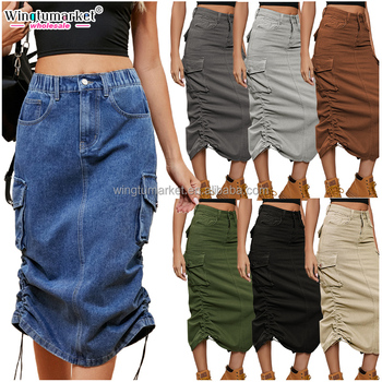חומצה לרחוץ חצאיות מטען כפתור המותניים אלסטי מתכוונן כיסים בצד מוצק שרוך midi ג 'ינס חצאית ארוכה