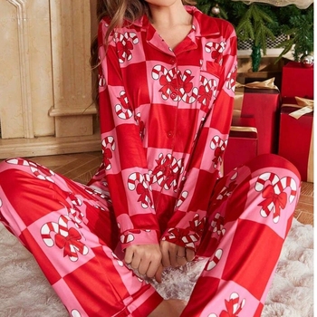 נשים פיג 'מה סט חג המולד משובץ סוכריות הדפסה שרוול ארוך שרוולים חולצה מכנסיים שני חלקים